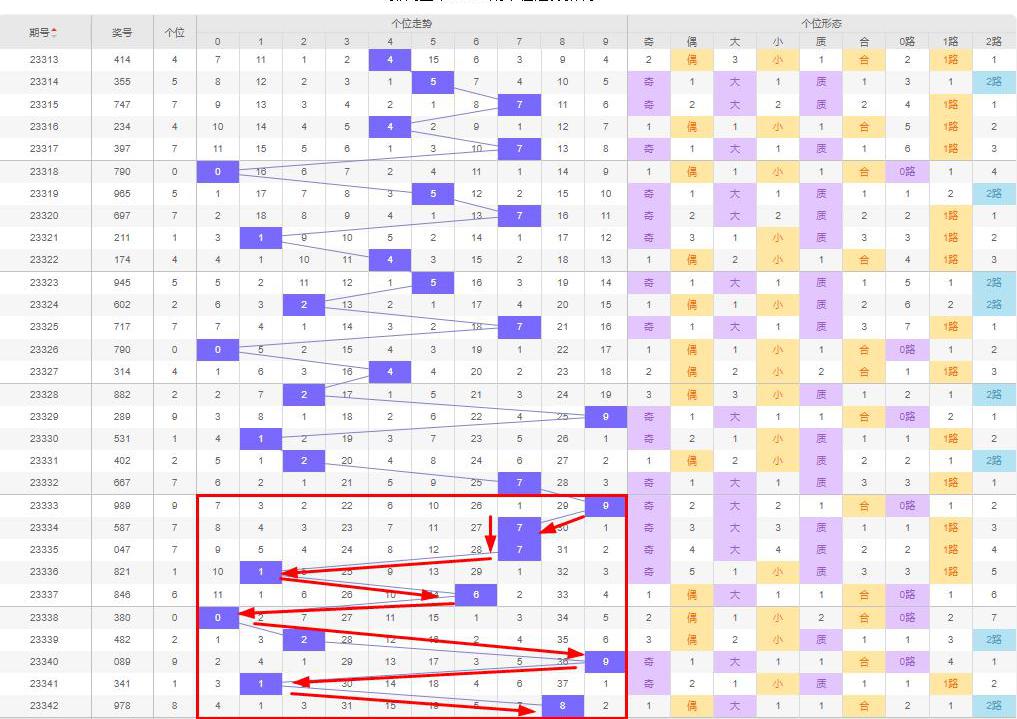 百位数字从第23340期至第23342期,已连续3期出现0路号上,已经达到30期内0路号最大连出3次;从第23338期至第23342期,已连续5期未出在2路号上,本期百位数字出2路号的概率很大。