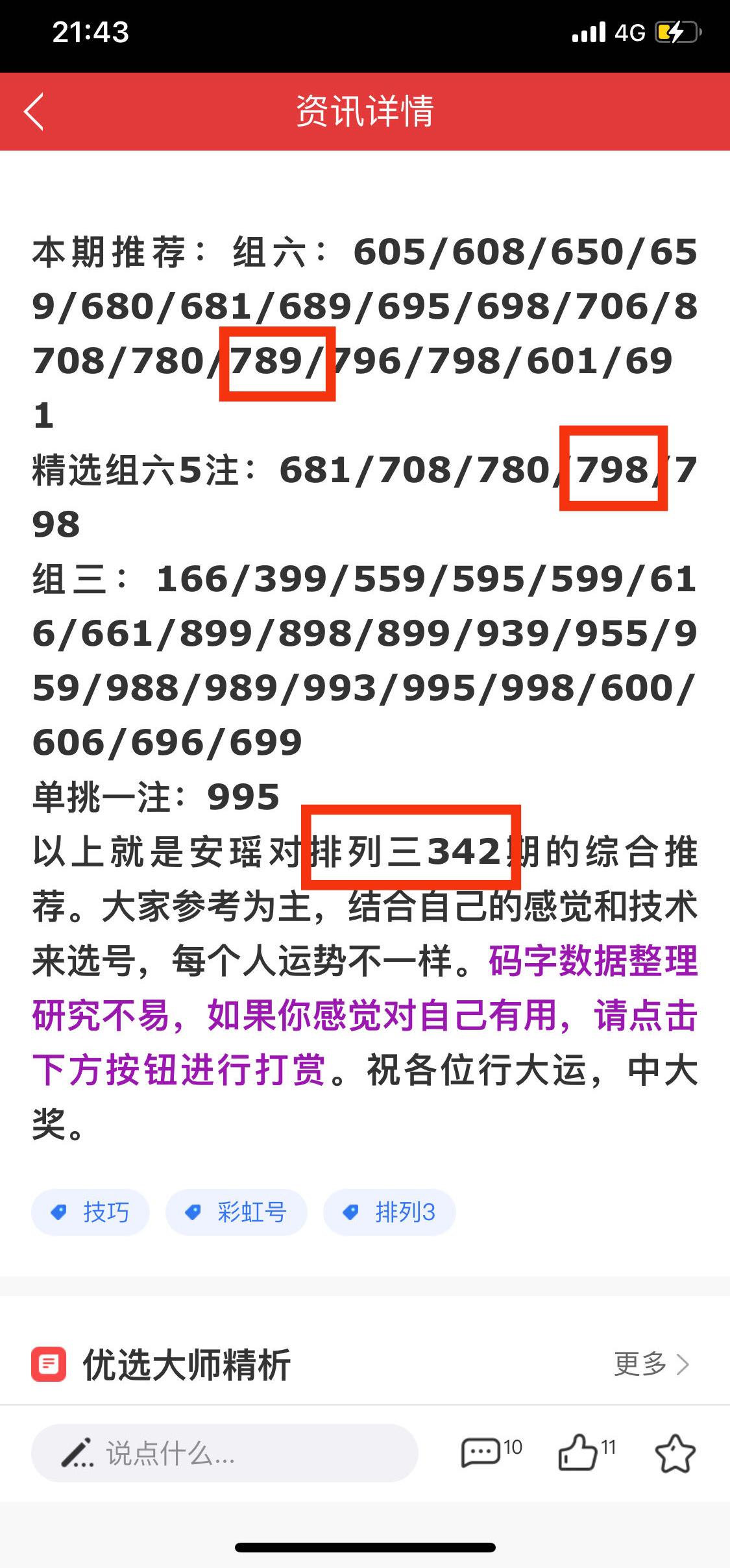 本期推荐:组选:226/228/288/445/455/556/558/588/266/566/667/677/338/388。组六直选:415/451/456/459/514/516/541/546/549/615/645/651/654/659/265/268组三直选:445/454/455/544/545/554/556/655/656/566/226/622/626/282/228/855/858/885单挑一注:226以上就是安瑶对排列三343期的综合推荐。大家参考为主,结合自己的感觉和技术来选号,每个人运势不一样。码字数据整理研究不易,如果你感觉对自己有用,请点击下方按钮进行打赏。祝各位行大运,中大奖。