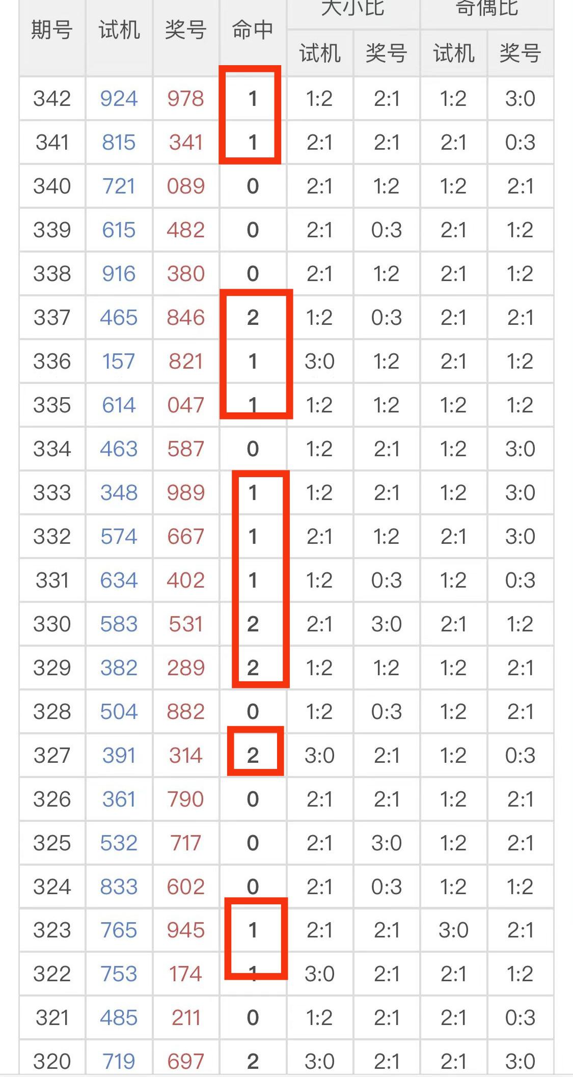 目前为为止排列三组三遗漏9期,排列三在近20期开奖数据中,组三最大遗漏5期,近期刷新间隔9期。昨天开出顺子号,今天重点关注组三开出,今天以组三为主。一、遗漏目前排列三单双遗漏最大遗漏为偶奇偶,遗漏25,期历史最大遗漏48期。2.跨度0遗漏332期,最大遗漏最大遗漏451。排列三上次开出豹子号是在今年年初,接下来如果连续出现组三或着怪号频繁出现可以考虑豹子号开出。组六连续9期开出,昨天开出顺子号。当组三大遗漏时容易出现特殊号码开出,顺子组三豹子号等,如果组三继续遗漏可重点关注豹子号开出。二、通过试机号来确定胆码1.当期试机号选胆。统计了近20期试机号开出胆码的情况有12期,概率60%。最近10期中6期开出重号其中一期开出2个胆码。近5期有2期开出试机号重码,上期在断层三期后连续两期开出试机号重码。近二期均有试机号重码开出,本期考虑在遗漏三期后的回补,本期看好试机号重码继续回补。通过近期试机号命中开奖号概率及结合近期试机号开出胆码的情况。可以确定下期是否会开出试机号的重码。上期开出试机号重胆,在断层3期后上二期开出试机号重码,近期试机号重码较冷,近五期连续遗漏三期后回补2期,本期看好继续回补。因此本期重点关注开出试机号重码。试机号重一码情况,确定一码就可以排除另外两码,即选号又杀号,减少选号范围,提升命中率。因此本期预测会有一码试机号重号。试机号可下午5点左右查询,到时候依据试机号调整选号号码。3.通过上期试机号对应码两两组合,杀本期二码。341期试机号为924对应码为024,可以杀024两两的组合 02/04/24。下图为近期试机号出号情况。
