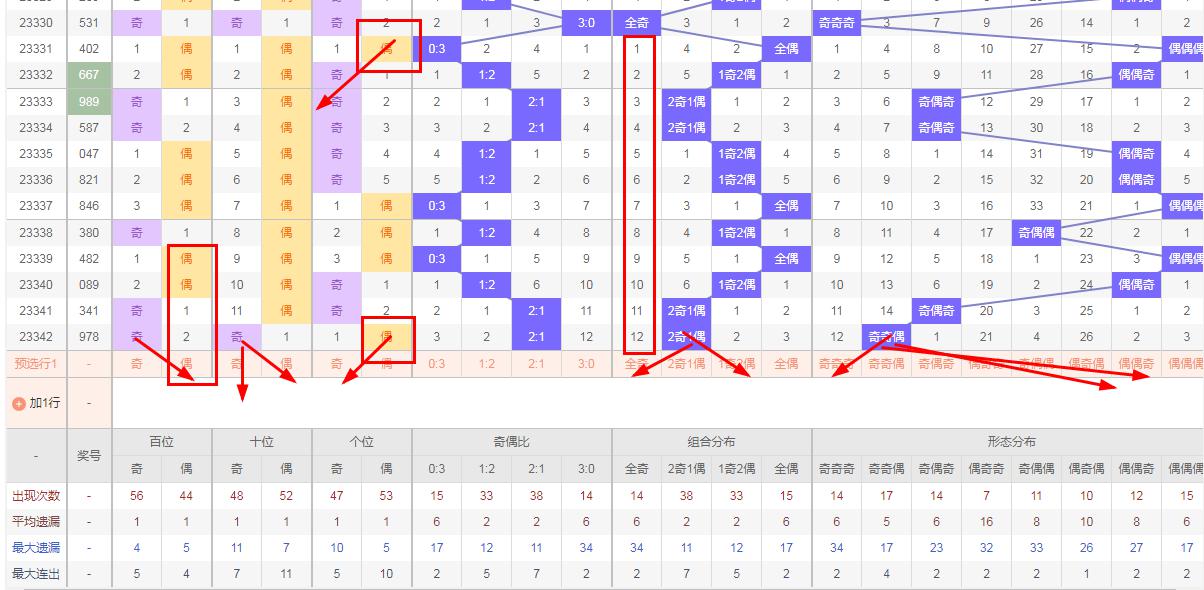 排列三 奇偶分析:从上图可以看出排列三100期内百位奇偶比为56比44,十位奇偶比为48比52,个位奇偶比为47比53.十位的比值比较均衡,但是百位和个位的比值偏差就有点大,历史奇偶形态走势数据开出奇奇偶后下期的走势为,第322期开出奇奇偶 后323期开出奇偶就走势,第326期开出奇奇偶后327期开出奇奇偶 走奇势。327期开出奇奇偶 后328期的走势为偶偶偶。本期应该注意奇奇奇或偶奇奇所以排列三第2023342期奇偶形态推荐奇奇奇,偶奇奇形态,其中偶奇奇形态当前以遗漏21期要重点关注。本文由为彩网作者钱是生命动力所著请勿转载
