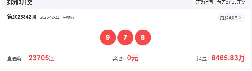 排列三第2023342期开奖回顾:开奖号码:978,形态组六