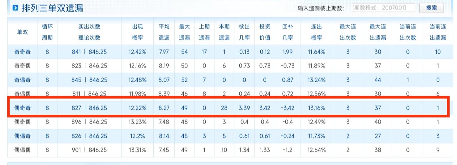 目前排列三单双遗漏最大遗漏为偶奇奇,遗漏28,期历史最大遗漏4期。