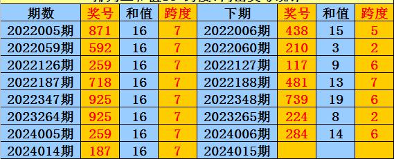 在和值16+跨度7同出之后,下期跨度奇偶比为2:5,偶数跨度活跃,本期跨度继续关注偶数;