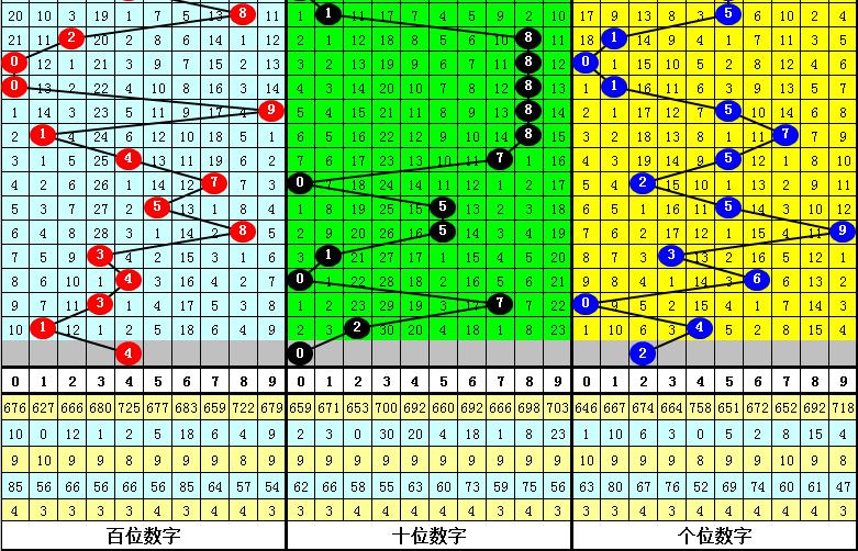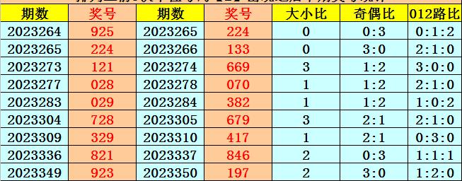 在百位前9次出现号码1之后,下期百位分别开出奖号:5-6-8-1-9-5-9-5-4,其中开出号码个数012路比是3:2:4,奇偶比是6:3,大小比是7:2。