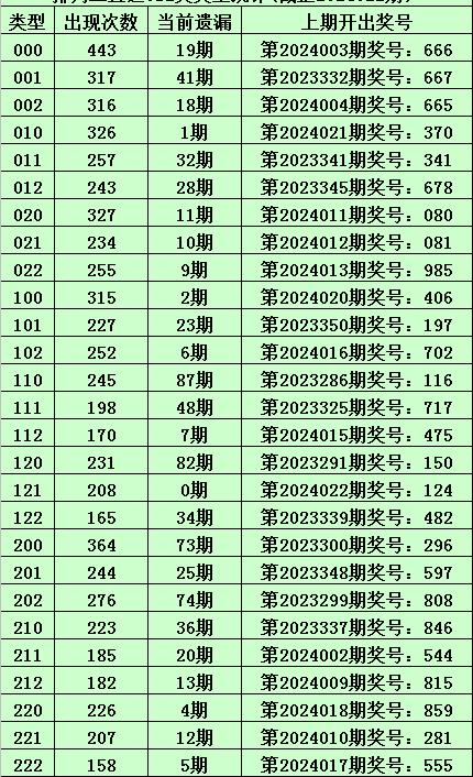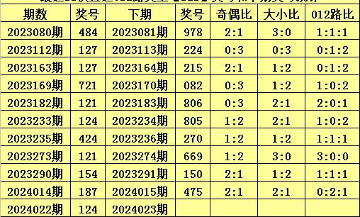 上期回顾:体彩排列三第2024022期开出奖号:124,其012路比为0:2:1,奖号012路类型为:121。
