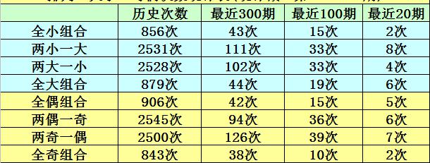 连续10期奖号中,两小一大形态开出3期,两大一小形态开出2期,全大形态开出3期,全小形态开出2期,本期大小形态判断:两大一小奖号。