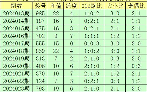 开奖回顾:排列三第2024023期奖号开出:793,组选类型:组六,大小比为2:1,奇偶比为3:0,和值为19,跨度为6。