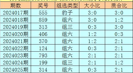 上期回顾:排列三第2024025奖号开出314,奖号质合比为2:1,大小比为0:3,跨度为3,类型为组六。