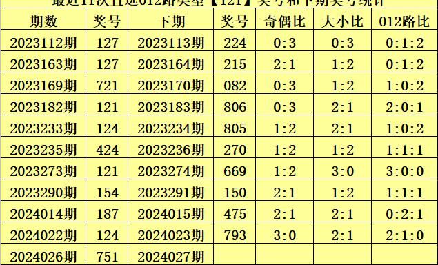 排列三上期开出奖号为:751,其直选012路类型为121,历史上直选121号码已开出了209次,最近11期分别开出奖号为:127、127、721、121、124、424、121、154、187、124、751。