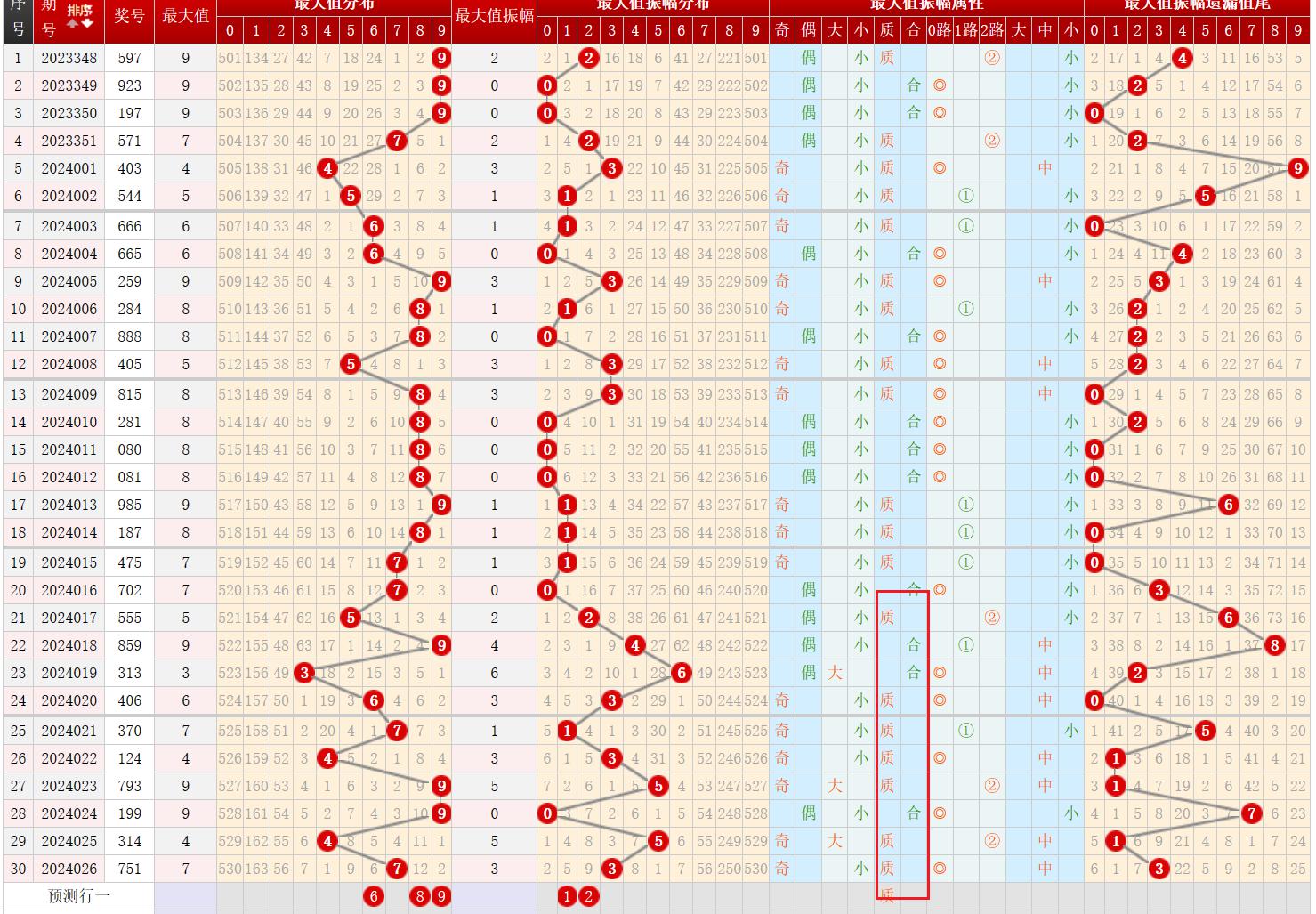 从最大值振幅大小属性来看,近10期内小数容易连开,本期小数出号可能性高;从质合属性来看,近10期内质数出号数量多于合数,可见质数更容易出号;故本期最大值振幅应该主要考虑小数、质数号码;符合条件的为12;通过振幅计算得出,本期最大值可能为689。