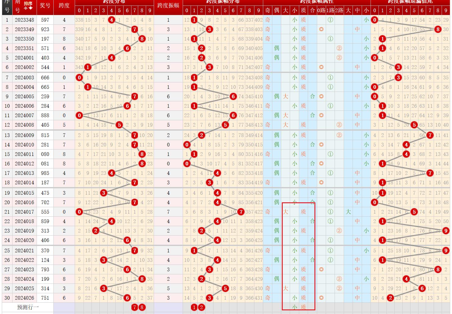 通过观察跨度及跨度振幅走势图,可以发现:从跨度振幅大小属性来看,近10期内小数容易连开,本期小数出号可能性高;从质合属性来看,近10期内质数容易连开,上期开出了质数,本期应该仍会开出质数;故本期跨度振幅可能为小数、质数号码。符合条件的为12;通过跨度振幅计算,本期跨度可能为78。