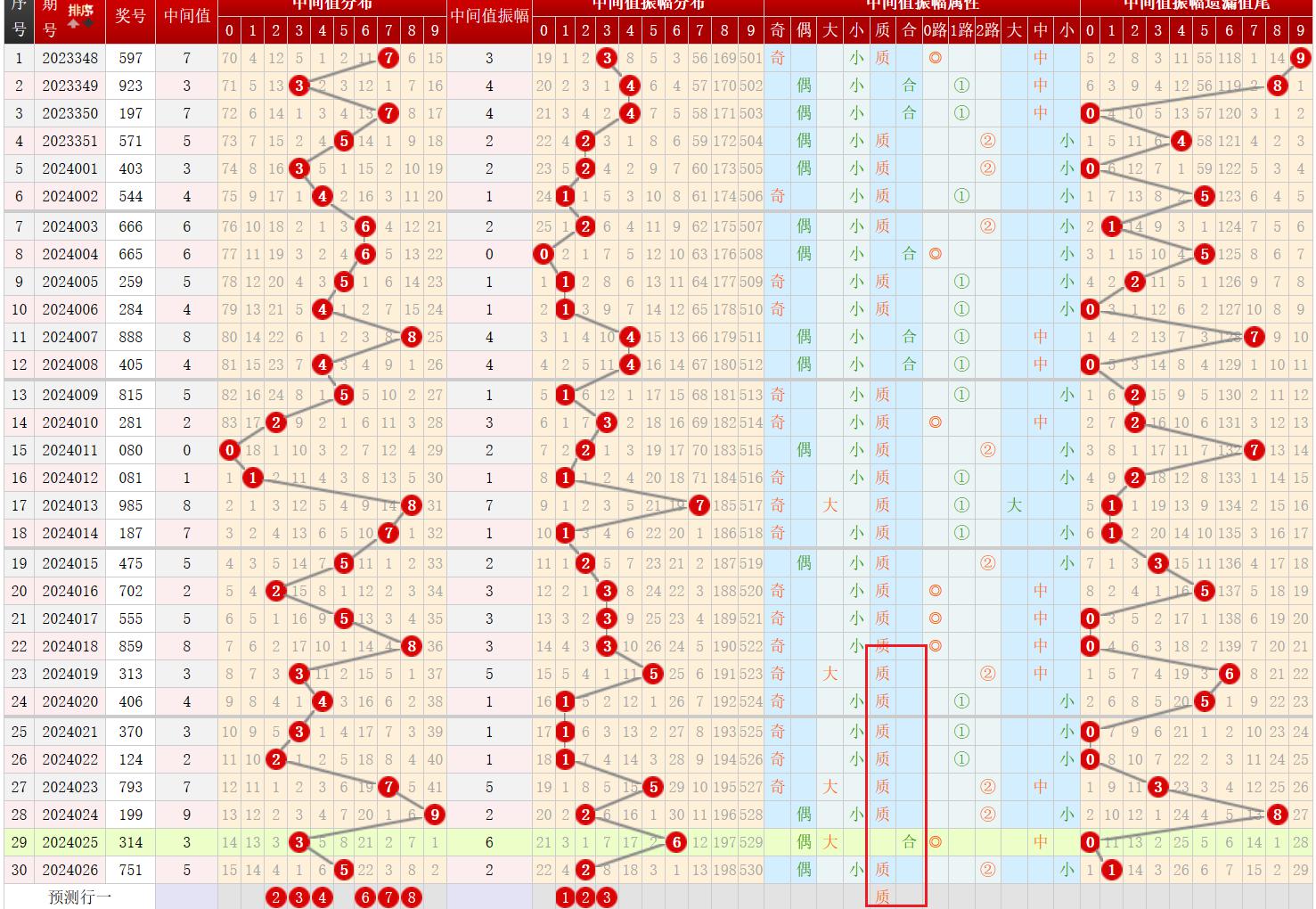 从中间值振幅质合属性来看,近10期内质数容易连开,上期开出质数,本期质数出号可能性高于合数;从大小属性来看,近10期内小数容易连开,上期开出了小数,本期应该仍会开出小数;故本期中间值振幅应该为小数、质数号码;符合条件有123。通过中间值振幅计算,本期中间值可能为234678。