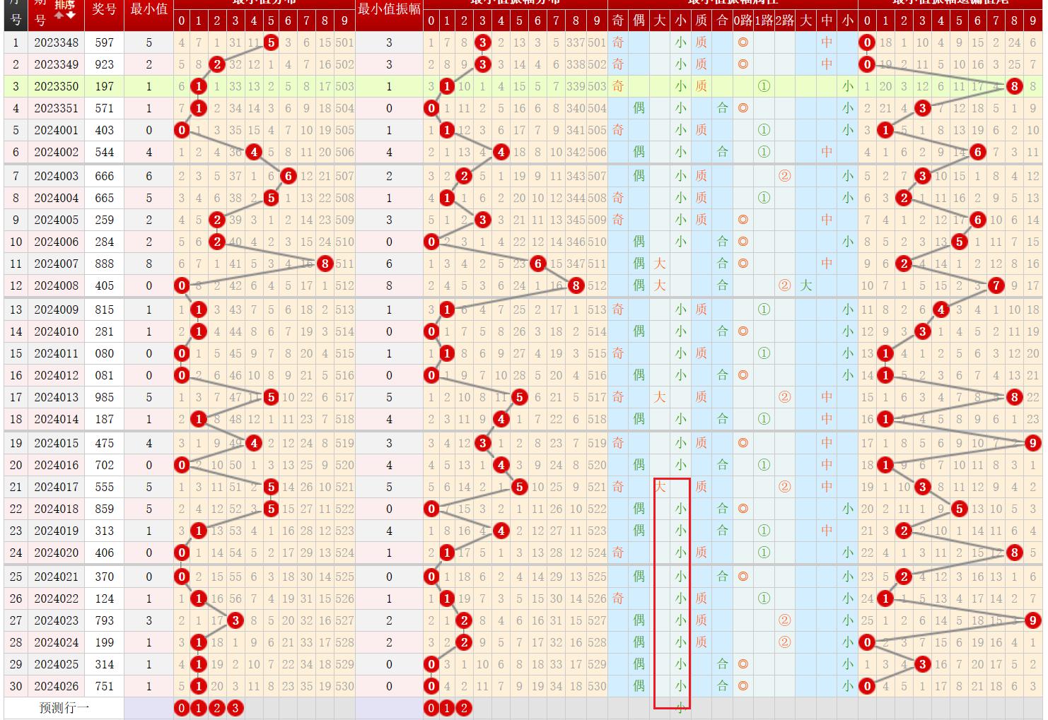 从最小值振幅大小属性来看,近10期内小数连开趋势强,本期大概率仍会延续该趋势;故本期最小值振幅应该主要考虑小数号码,则符合条件为012;通过振幅计算,本期最小值可能为0123。