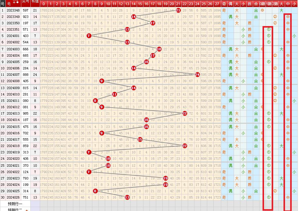 从上图可以开出,按和值大(14-27)小(0-13)分区,上期开出和值小,本期和值大小都有可能,和值偏大可能性大些。