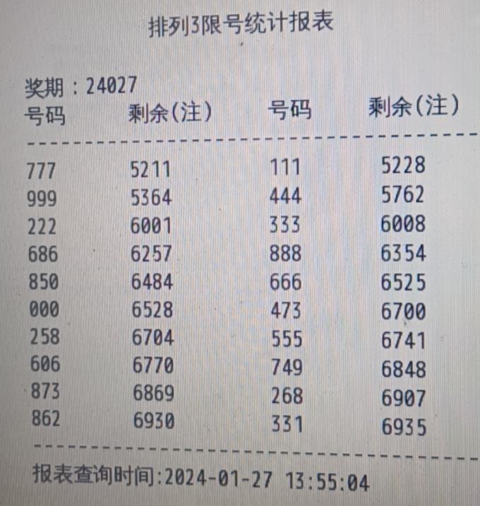 一、2024027期 排列3限号统计报表