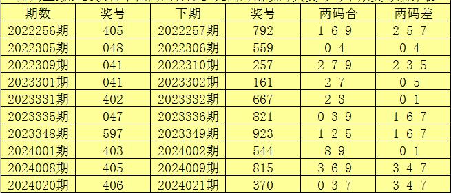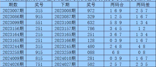 从以上统计可以看出,百个位两码合差0与8同时出现之后其下期两码合差表现最热的4个分别为:0235,本期百个位两码合差可以参考这四码中的数据。