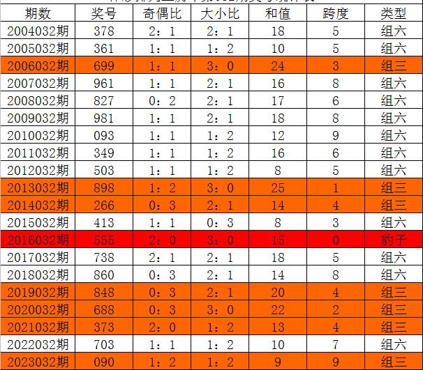 体彩排列三历年第032期开出奖号分别为:378、361、699、961、827、981、093、349、503、898、266、413、555、738、860、848、688、373、703、090。统计详见下表: