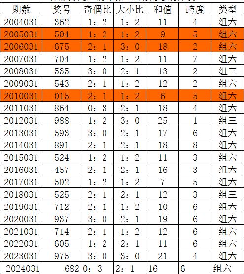排列三第2024031期奖号为682,奇偶比为0:3,大小比为2:1,和值为16,跨度为6。