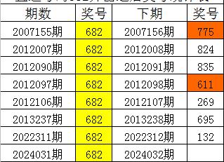 体彩排列三直选号码682历史上出现了8次,其下期分别开出奖号:775、824、835、611、269、695、132,统计如下表: