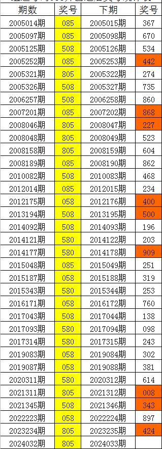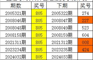 从上表统计可以看出,直选号码805开出之后,其下期奖号: