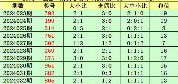 上期回顾:排列三第2024032期奖号为:805。奖号类型:组六,和值:13,奇偶比:1:2,跨度:8,大小比:2:1。