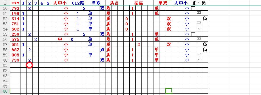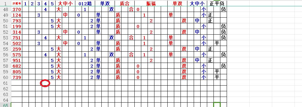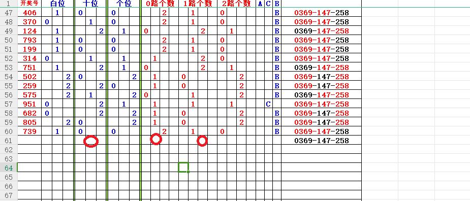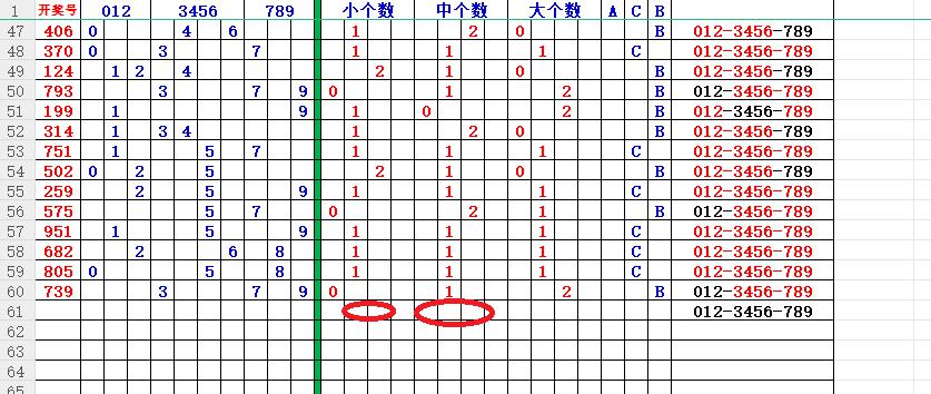 如上图56,012路分析0路出号的概率还是很大,本期可以从0路号入手做胆0369中选;看好369胆码。