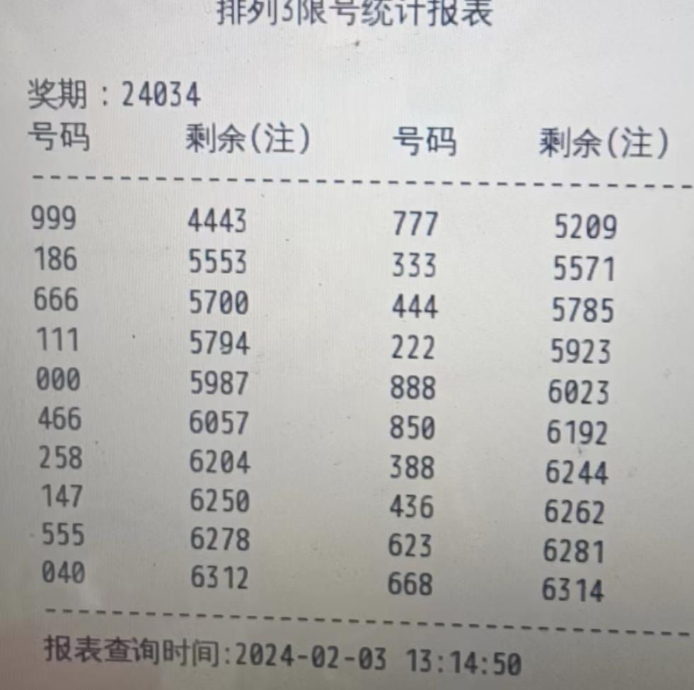 一、2024034期 排列3限号统计报表