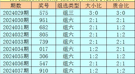 上期回顾:排列三第2024037奖号开出910,奖号质合比为1:2,大小比为1:2,跨度为9,类型为组六。