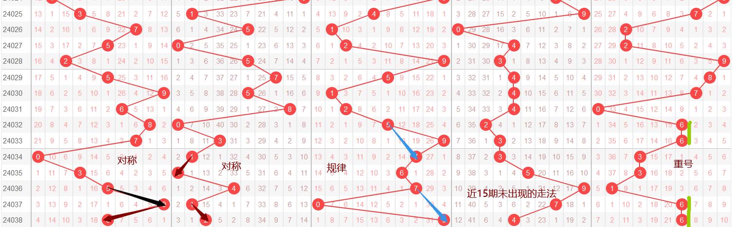 6-0与0-6对称,1-6-6-1构成对称图案,6-2近15期没有相同走法,6-3与上面的6-3对应,6-4与3-1对应,6-5与8-7对应