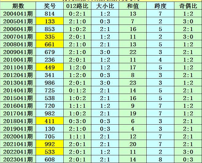 本期为排列三第2024041期开奖,开奖日期为:2024年2月20日,历史上排列三第041期已开出了20次奖号,历年同期开出号码分别为:814-133-853-335-661-679-236-449-341-986-725-538-720-982-411-130-705-992-533-608。