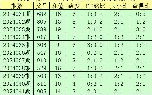 开奖回顾:排列三第2024041期奖号开出:905,组选类型:组六,大小比为2:1,奇偶比为2:1,和值为14,跨度为9。