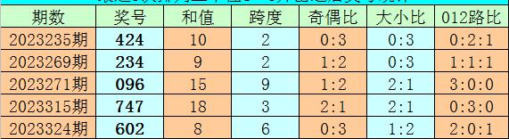 3、在以上0-9号码频次中,号码012路比为24:25:18,奇偶比为38:29,本期预计百位开出偶数号码,参考号码8。