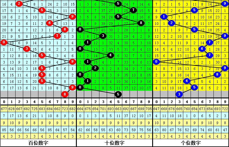 1、排列三最近两期百位号码分别开出5和9,历史上百位号码连续两期分别开出5和9的奖号出现了68期。前五期开出之后其下期奖号分别为:773、234、197、682、529;