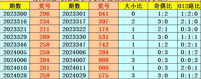百位号码:百位上期奖号为0路、偶数、大号:2,历史上百位号码2共开出668期,前一次开出期数在第2024028期,上期奖号隔14期再次开出。