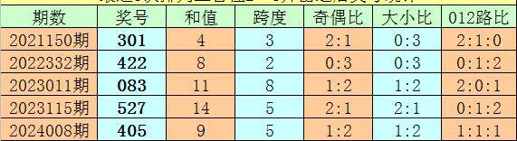 1、排列三最近两期百位号码分别开出2和8,历史上百位号码连续两期分别开出2和8的奖号出现了62期。前五期开出之后其下期奖号分别为:301、422、083、527、405;