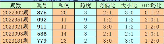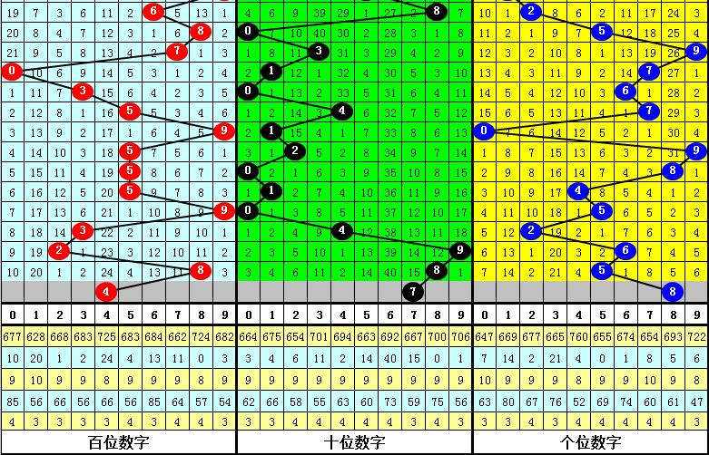 3、在以上0-9号码频次中,号码012路比为24:18:19,奇偶比为33:28,本期预计百位开出偶数号码,参考号码4。