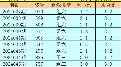 上期回顾:排列三第2024045奖号开出757,奖号质合比为3:0,大小比为3:0,跨度为2,类型为组三。