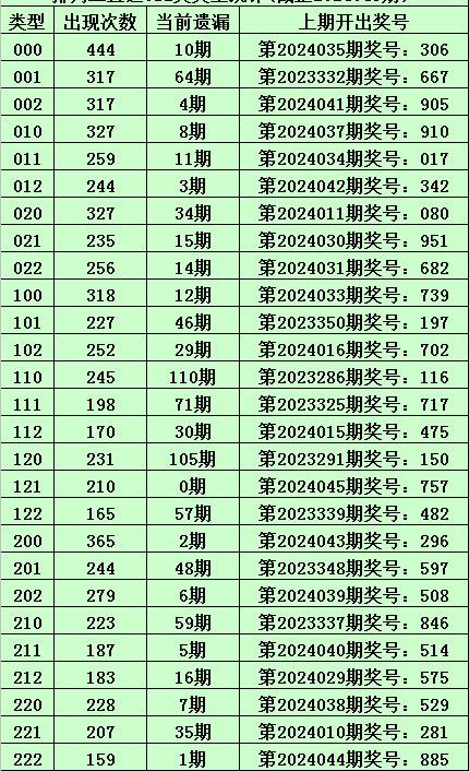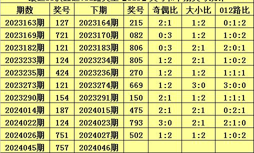 上期回顾:体彩排列三第2024045期开出奖号:757,其012路比为0:2:1,奖号012路类型为:121。