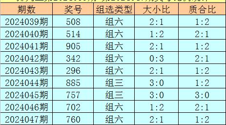 上期回顾:排列三第2024047奖号开出760,奖号质合比为1:2,大小比为2:1,跨度为7,类型为组六。