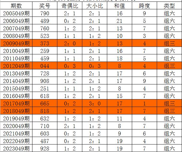 体彩排列三历年第049期开出奖号分别为:790、489、760、523、373、259、459、044、728、908、251、618、665、818、632、710、603、487、928。统计详见下表: