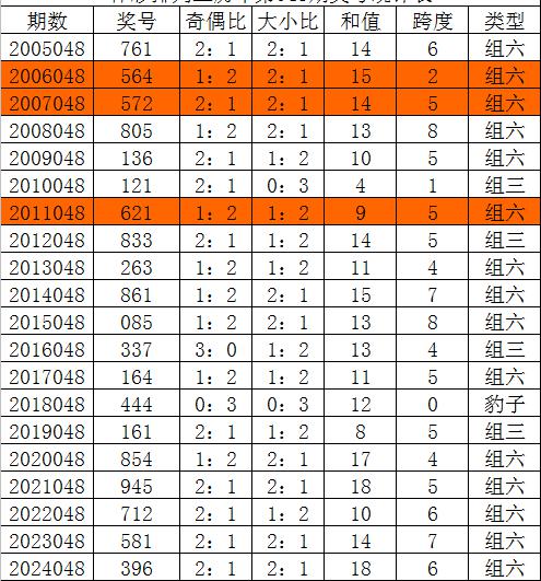 排列三第2024048期奖号为396,奇偶比为2:1,大小比为2:1,和值为18,跨度为6。
