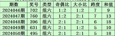 上期回顾:排列三第2024050期开奖号码为495。奖号类型为组六,奇偶比为2:1,大小比为2:1,跨度为5,和值为18。