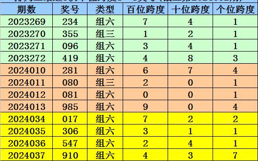第2024010-第2024012期奖号:281、080、081,其下期奖号为:985,末位号码跨度为9;