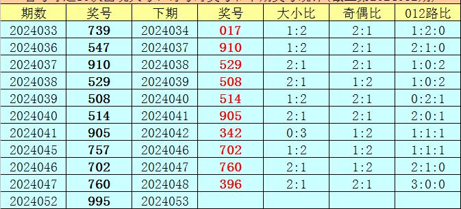 在首号球前10次开出大号、奇号类型之后,其下期分别开出奖号:017、910、529、508、514、905、342、702、760、396,其中号码012路比为5:2:3,奇偶比为9:1,大小比为7:3。