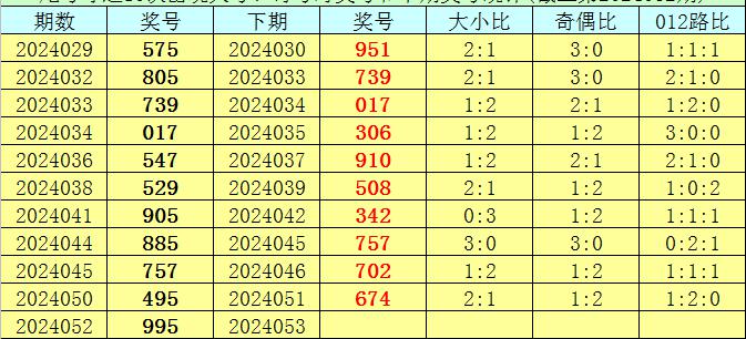 在尾号球前10次开出大号、奇号类型之后,其下期分别开出奖号:951、739、017、306、910、508、342、757、702、674,其中号码012路比为3:4:3,奇偶比为4:6,大小比为5:5。