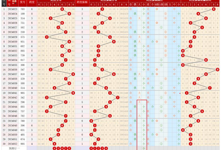 从跨度振幅大小属性来看,近10期内小数容易连开,上期开出了小数,本期应该仍会开出小数号码;故本期跨度振幅应该考虑小数号码;符合条件的为01234。通过跨度振幅计算得出本期跨度应该为45678。