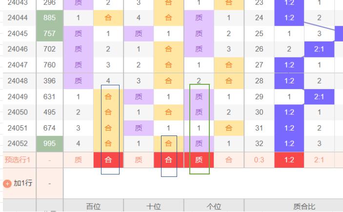 ④:质合走势分析:个位走势质合交替如图差别小,本期个位推测为质:12357.十位质合走势交替差别较平均,本期十位推测为合:04689.百位近期质合走势交替差别小,本期百位推测为合:04689.那么本期分析结果为2合1质,个位:12357 十位:04689 百位:04689