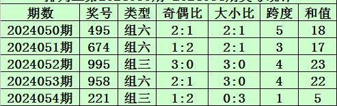 上期回顾:排列三第2024054期开奖号码为221。奖号类型为组三,奇偶比为1:2,大小比为0:3,跨度为1,和值为5。