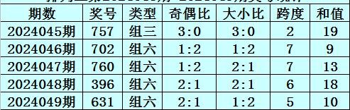 跨度分析:最近5期分别开出跨度:5、3、4、4、1,本期预计跨度走大,一码跨度参考2。