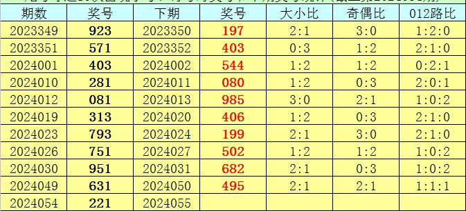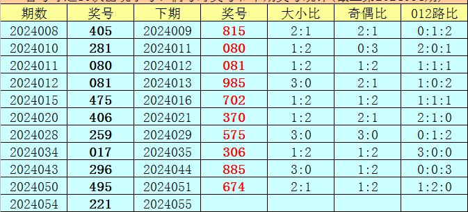 在尾号球前10次开出小号、奇号类型之后,其下期分别开出奖号:197、403、544、080、985、406、199、502、682、495,其中号码012路比为4:2:4,奇偶比为5:5,大小比为5:5。